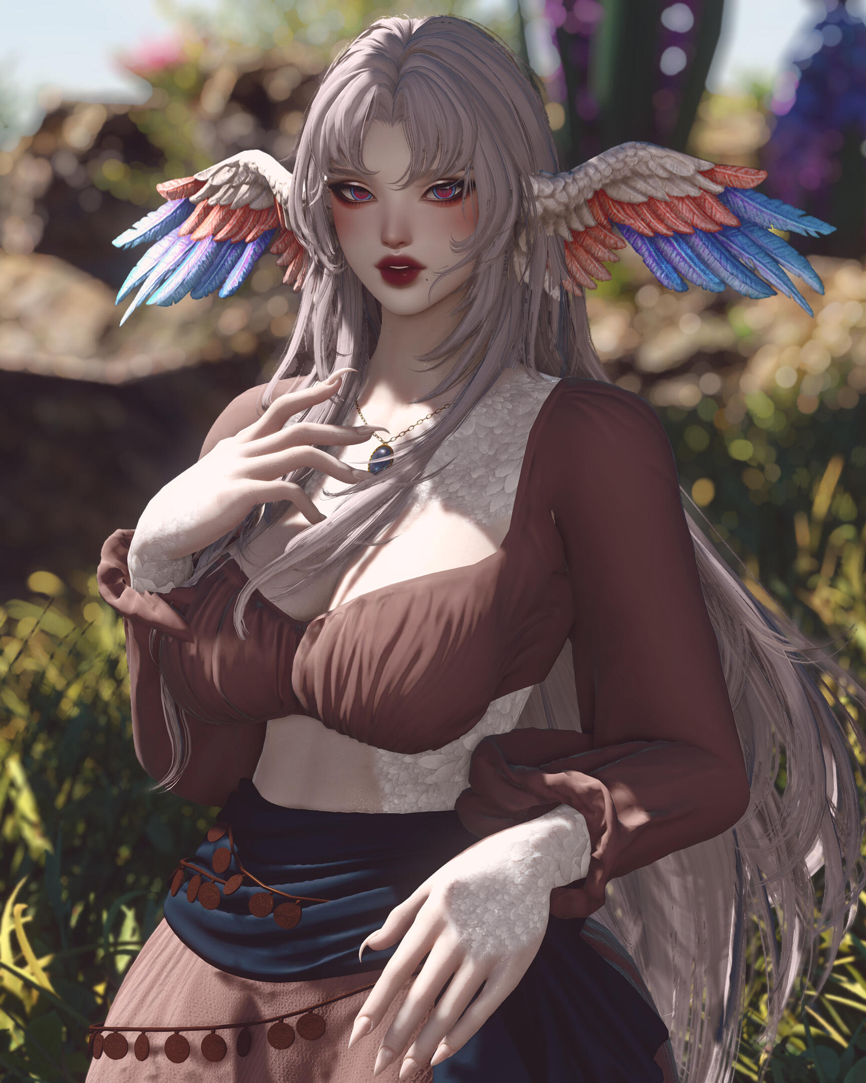 In the lands above in The Sea of Clouds, there resides a secluded clan of Au Ra. Unique in appearance, their evolution traded scale for feather. The people of this clan developed a deep connection with winds that swept across their lands. A belief resonated among them that it carried the whispers of the world, echoes of past lives and the voices of unseen spirits. To them, the wind is not merely an element but a living force, one that can be guided, pleaded with, or even commanded through song.Among these people, a rare few are born with the ability to harmonize with the wind through their voices. These individuals, known as Sky-Singers, are treasured figures, capable of calling forth gentle breezes or powerful gusts through carefully composed melodies. They are trained from a young age to use their voices in sacred rites, guiding the winds to carry messages, aid in hunting, or calm approaching storms. Among this rare few was Aine. Born with an extraordinary gift, her songs resonate deeply with the aetheric currents, shaping them with ease. As a child, she could hum a tune and feel the wind respond, playfully lifting leaves or shifting the air around her. Her elders recognized her as a prodigy, one who could not only guide the wind,but sing it into being.While her abilities were seen as a blessing, they also became a heavy responsibility. Aine was trained rigorously, expected to master ancient chants and the precise tonal shifts required to shape the wind. However, her connection to the wind was raw and untamed, she would sometimes sing without control, stirring sudden gusts or even calling forth violent tempests when her emotions ran high.One fateful festival night, she was chosen to perform a sacred song, one meant to invite the night breeze through their village in celebration. But as her voice lifted into the sky, the air did not stir with gentle rhythm. Instead, a tempest answered. The winds howled, fierce and unrelenting, tearing through her home with violent force. Though no lives were lost, many were injured and deeply shaken. And fear of the young Sky Singer swept across the people.After the storm, the ruling elders gathered. Though they did not cast her out, they decreed that she could never sing again. The winds had shown their answer, and they feared what might come if her voice were loosed once more. And for a time she would obey. Her voice, once a source of joy, became a thing of fear. No longer was she the pride of her people, now, she was a warning, a tale whispered to young ones about the danger power unchecked. She lived in silence denying the urge to sing, even in solitude. But the wind never forgot her. It still curled around her in restless eddies, still sighed through her feathers as if pleading for the melody it had lost.One day, she could bear it no longer.If her voice was truly cursed, then she needed to understand why. If she had called a storm, then she had to learn how to control it. And if the wind still longed for her song, then perhaps... she was not meant to stay silent forever. With quiet defiance, she left her home behind, traveling beyond the world above for the first time.Somewhere in the vast world beyond, there had to be an answer.